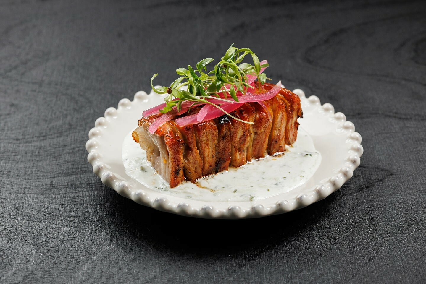 Свиная вырезка, сало, соль, сметана, свежие огурцы, винный уксус, сахар, кинза, маринованный красный лук, микрозелень