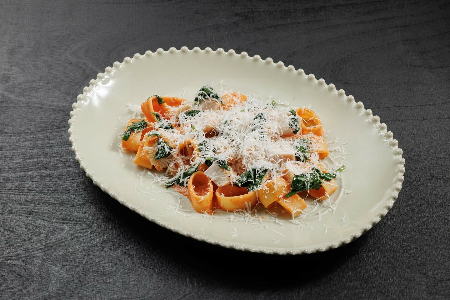 паста каламарата, томаты в собственном соку, лук репчатый, морковь, стебель сельдерея, розмарин, вино белое сухое, чесное, соль, сахар, перец, филе куриное, лавровый лист, шпинат, сливочное масло, куриный бульон, сливки, сыр пармезан