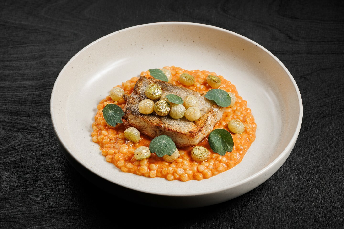 судак, птитим, куриный бульон, томаты в собственном соку, лук репчатый, морковь, стебель сельдерея, тимьян, белое сухое вино, чеснок, соль, сахар, перец, сливки, микрозелень, масло растительное, масло сливочное