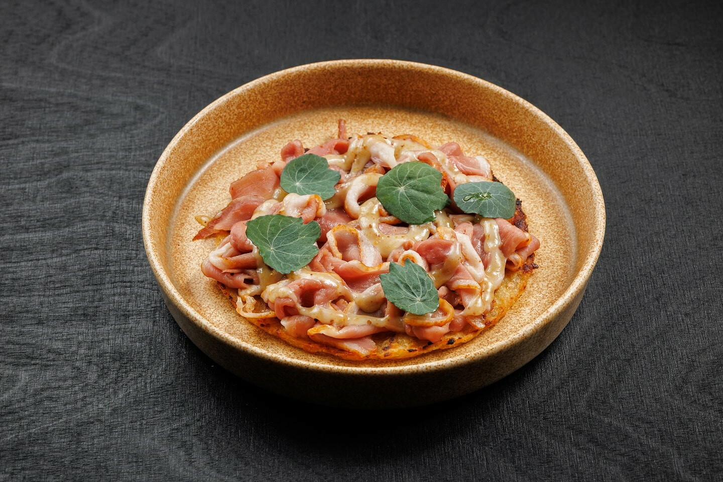 Соус сливочный (мука пшеничная, молоко, соль, сливочное масло, сыр пармезан, чеснок), сыр моцарелла, свиной бекон, пармезан, оливковое масло