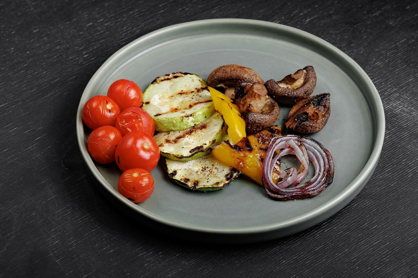 Кабачок, помидоры черри, болгарский перец, грибы шампиньоны, красный лук, соль, перец чёрный молотый, оливковое масло, растительное масло.