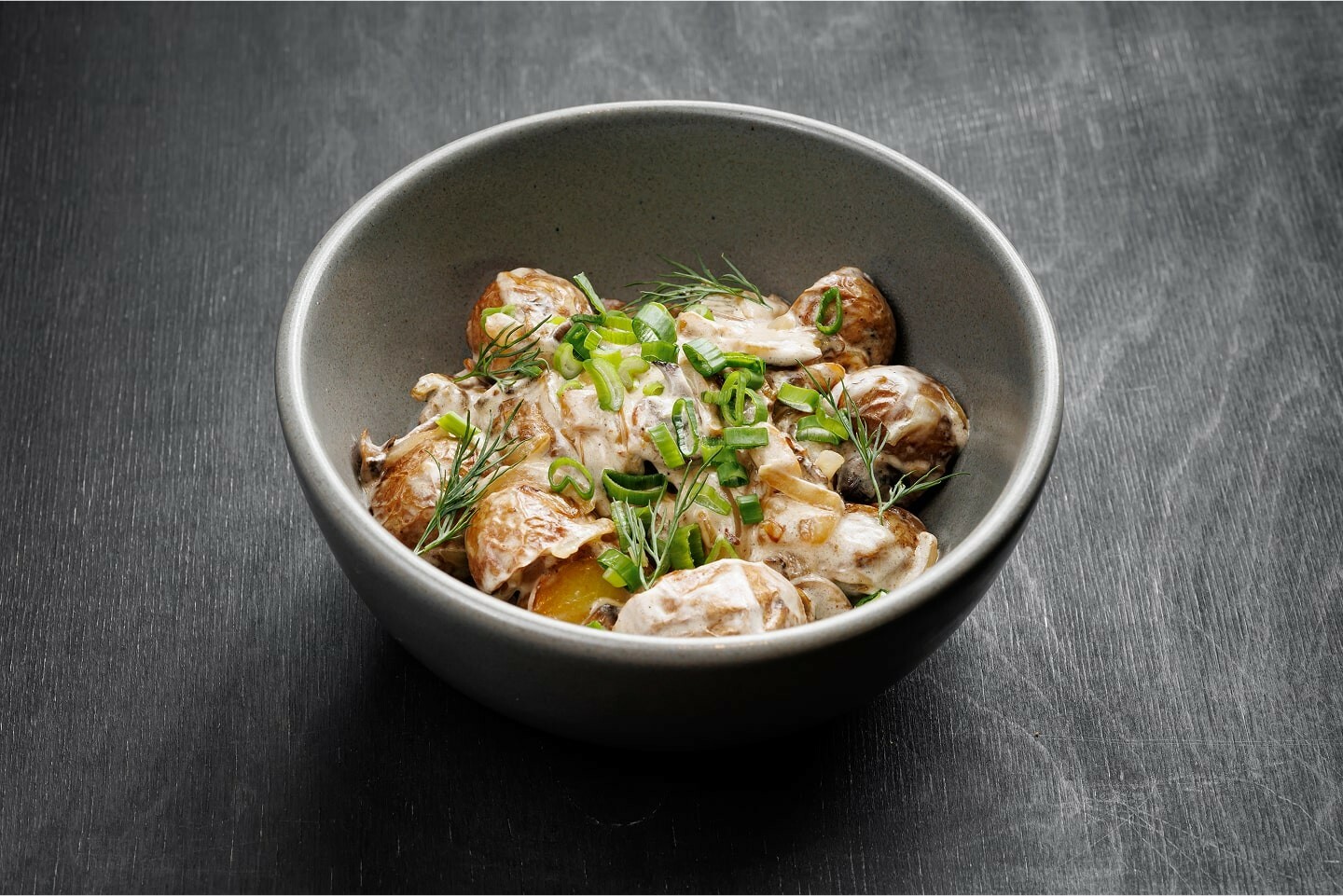 Картофель, белые грибы, грибы шампиньоны, свиное сало, сметана, соль, лук репчатый, лук порей, чеснок, зелень рубленая укроп/петрушка.