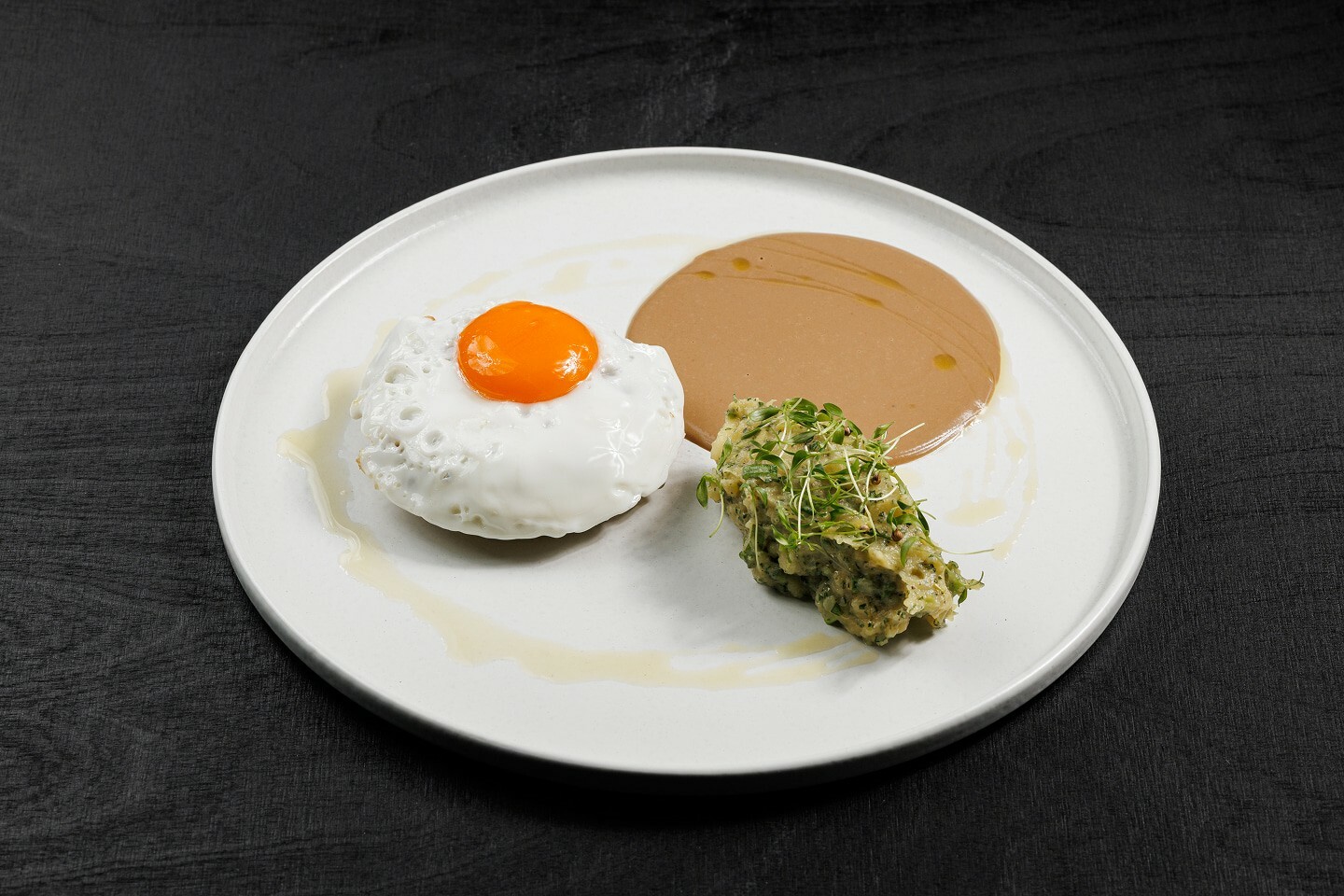 Говяжий бифштекс, картофель, соль, перец чеёрный молотый, соус бекон (картофель, лук репчатый, сливки 22%, белое вино, краситель пищевой), соус голландез ( яичный желток, сливочное масло, лимонный сок, соль), сметана, рукола