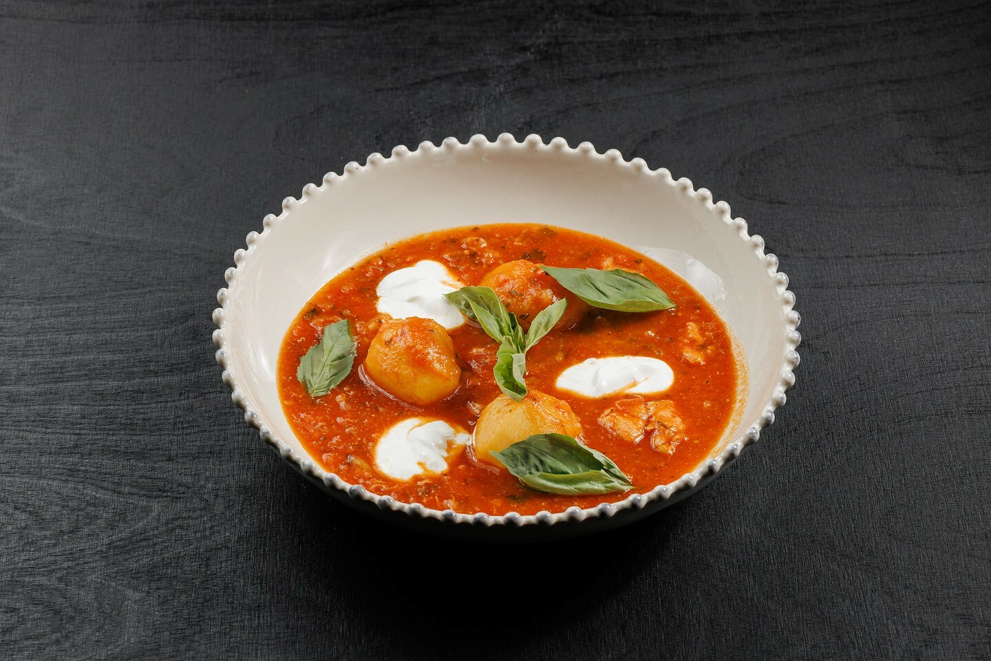 филе бедра кролика, мини картофель, лук репчатый, морковь, стебель сельдерея, томаты в собственном соку, базилик, соль, перец, сахар, тимьян, розмарин, чеснок, куриный бульон, сметана