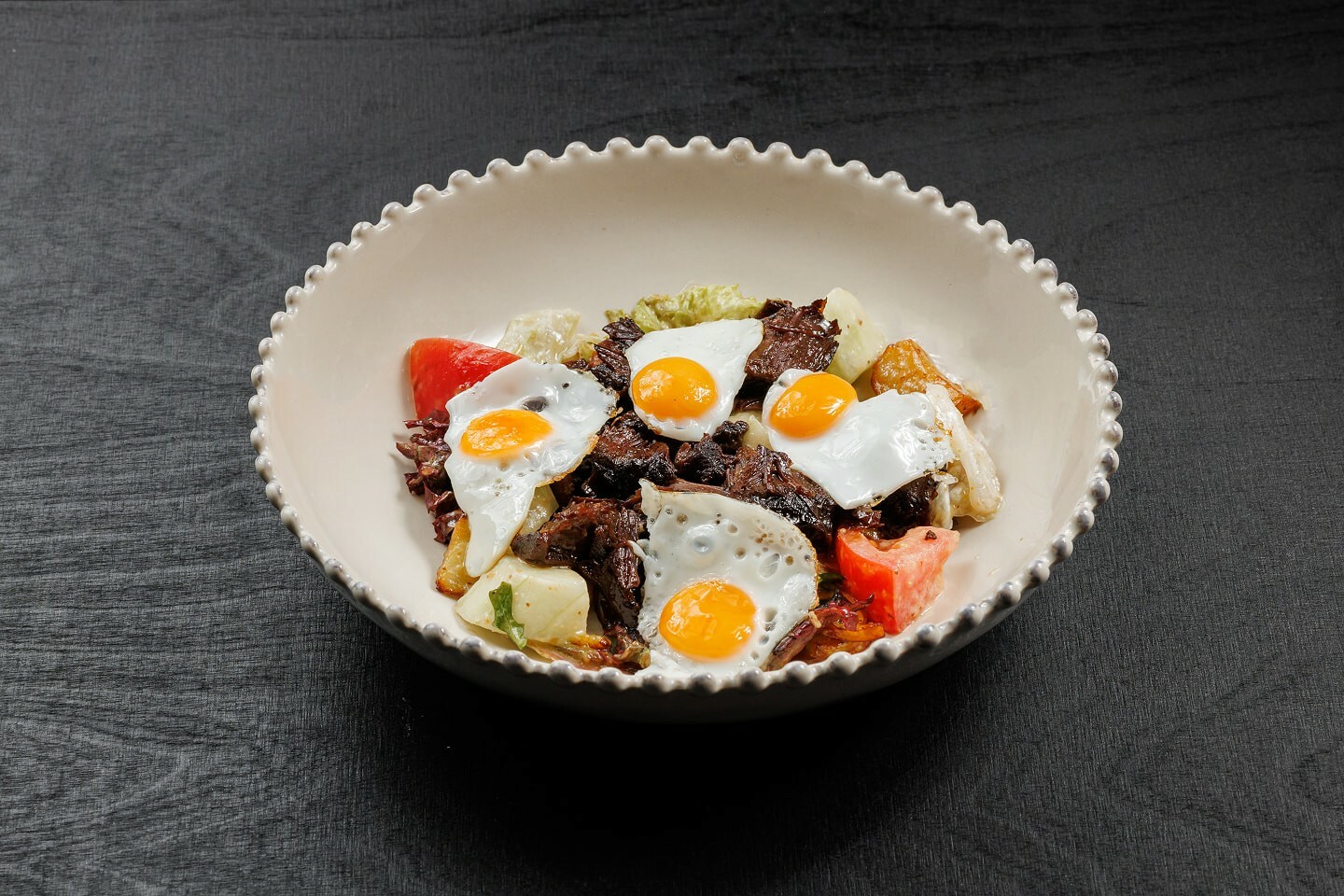 Картофель мини жареный, майонез, горчица, сладкий чили, чеснок, куриное бедро, буженина, отварной язык говяжий, салат айсберг, огурцы маринованные, болгарский перец, бальзамический крем, пшеничная лепёшка, кинза