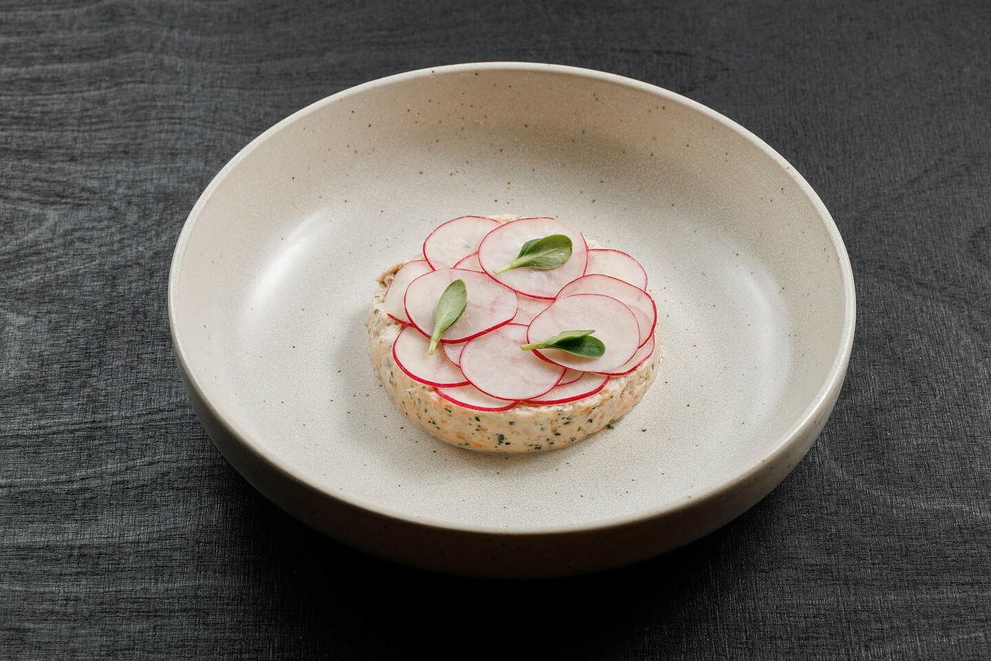 творожный сыр, сливки, соль, перец, лосось, лепестки миндаля, сок апельсина, редис, микрозелень, хлеб бородинский