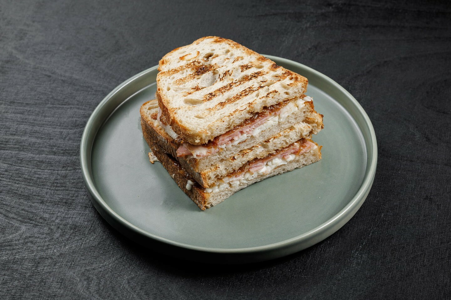 Томатный хлеб (мука, вода, соль, дрожжи, растительное масло, протертые помидоры, сахар ), пармская ветчина, оливковое масло, красный лук, крем-чиз, соус шрирача, сливки 33%, соль, рукола, бальзамический крем