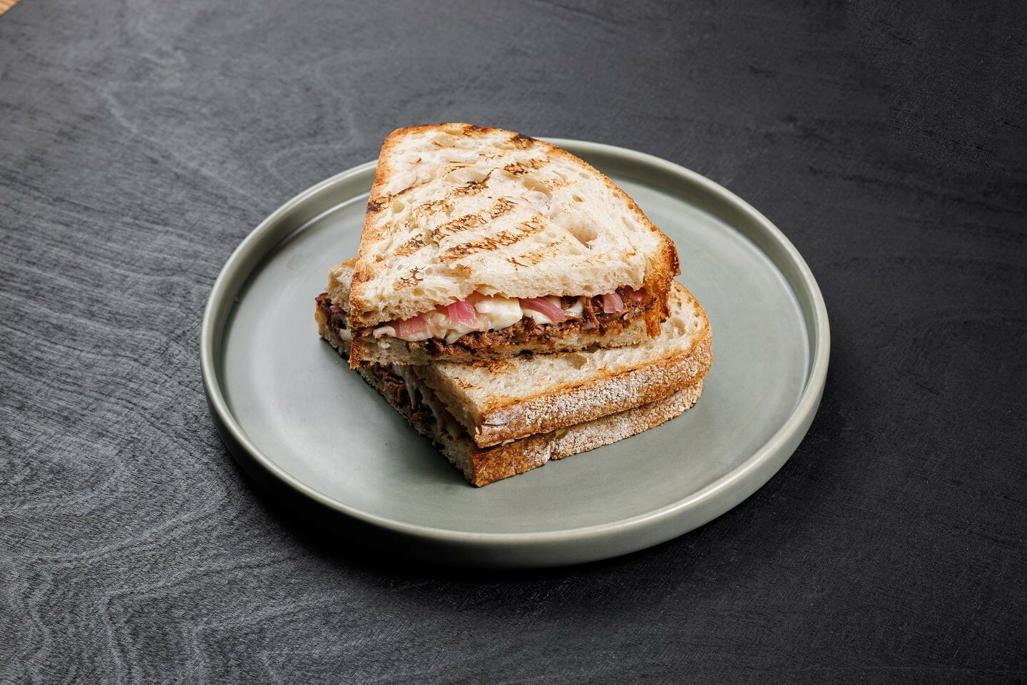 фермерский хлеб, говядина, фермерские маринованные огурцы, майонез, соус сладкий чили, соус ворчестер, сыр моцарелла, горчица зернистая, сухой чеснок, сахар, перец, красный лук, лавровый лист, винный ускус, соль